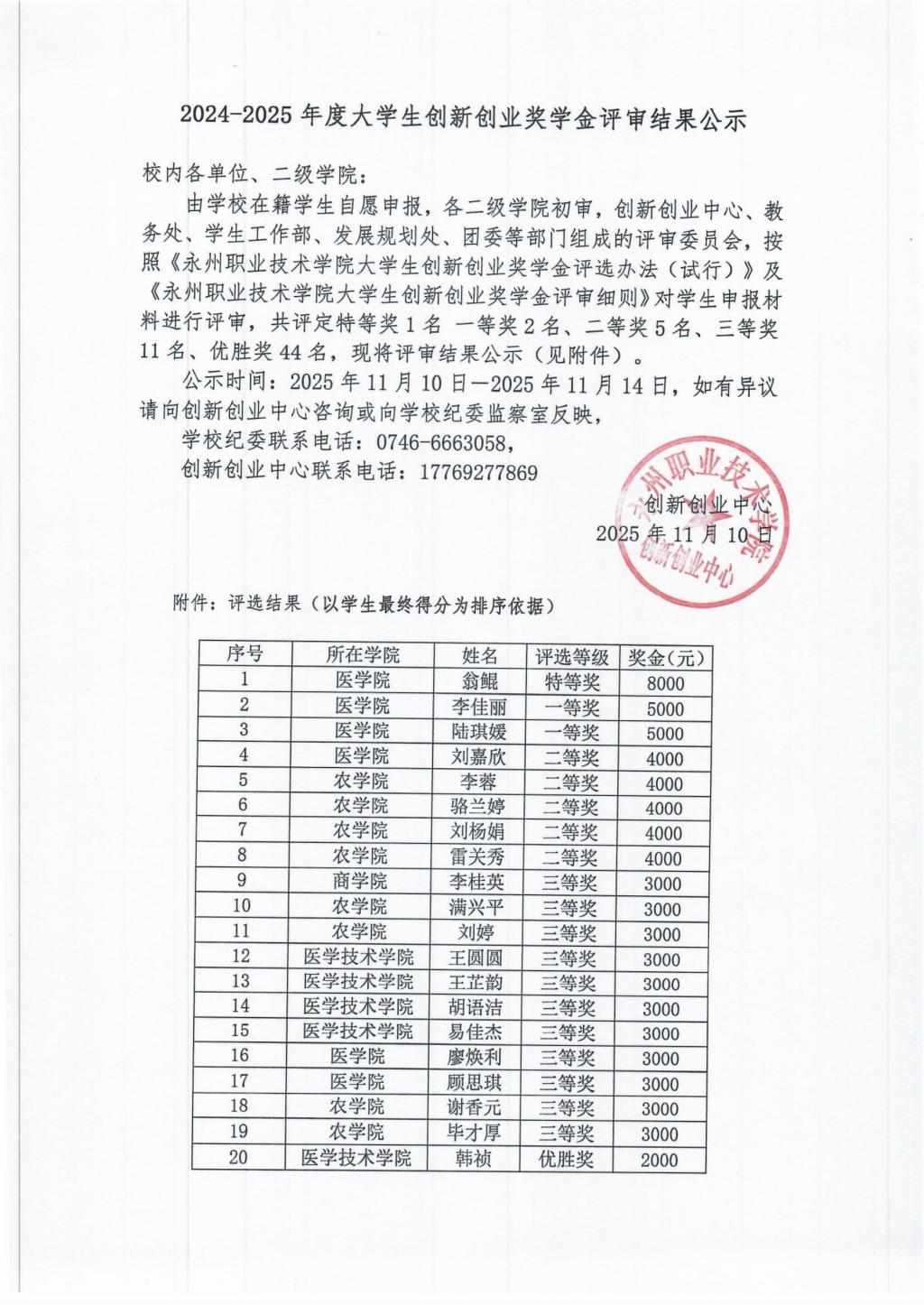 2024-2025年度大学生创新创业奖学金评审结果公示