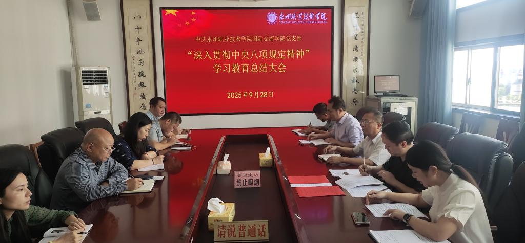2025年9月28日,国际交流学院党支部在行政楼四楼会议室召开了“深入贯彻中央八项规定精神”学习教育总结大会,支部全体党员及入党积极分子参会。在听取支部总结报告后,学校党委委员、宣传部长在讲话中指出,一要牢记作风建设永远在路上,必须抓常、抓细、抓长,要把作风建设融入学校工作的方方面面,持续努力、久久为功。二要牢记初心,将作风建设与双高校建设深度融合,结合岗位实际,为提高办学水平、培养合格人才作出应有的贡献。三要牢记使命,办好人民满意的教育,突出应用,增强忧患意识,以过硬的作风建设推动学校内涵式发展。