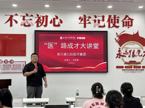 2025年4月22日下午,永州职业技术学院护理学院在一教学楼党员活动室开展了“医”路成才大讲堂——雅贝康口腔医疗集团就业宣讲会,此次讲座邀请了雅贝康口腔集团有限公司招聘经理王运祥部长围绕“职业和就业指导、口腔医疗行业就业形势”等内容为同学们开展就业知识讲座,帮助同学们明确就业目标,提升就业实战能力。