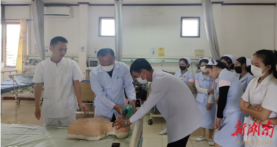 在乌多姆赛省医院,访问团成员陈思辉和刘丽妍老师对医卫类专业技术人员开展医疗护理技术培训。陈思辉针对心脏骤停病人开展了基础生命支持、高级心血管生命支持以及脑复苏技术方面的理论授课和实操训练,他还根据乌多姆赛省医院当前急救水平,在增强团队抢救能力、加强急救物品管理等方面提出了实际性建议和改进措施。刘丽妍开展了冠心病治疗培训,介绍了冠心病病人的病因、治疗、预防、护理等方面知识。刘丽妍还就冠心病治疗方法中的溶栓治疗、经皮冠状动脉介入治疗和冠状动脉搭桥术等方面做了详细讲解。培训结束后,访问团成员在该院副院长哥颂和护理部主任冯萨克女士(Synaly Vongsack)的陪同下参观了内科、外科、儿科和ICU病房,刘丽妍作为临床护理专家,从规范治疗室和处置室的设置、新生儿喂养和安全护理、ICU的探视制度和感控要求等方面提出了指导性意见。