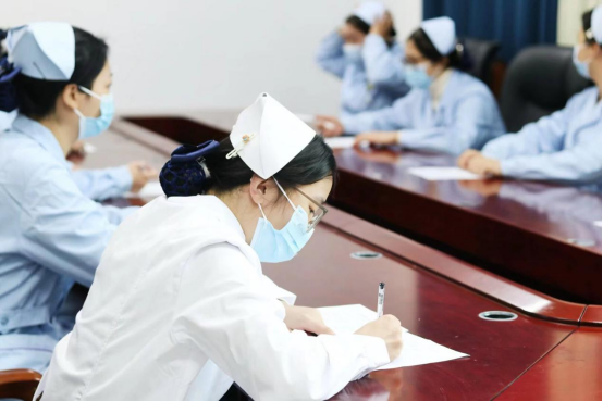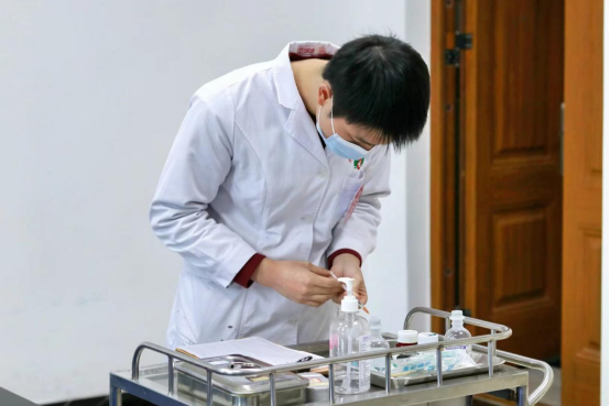 考核现场,氛围严肃而紧张。学生们首先要完成理论考试现场答题,随后按照抽签确定的顺序,有条不紊地进入实操考核环节。她们身着整齐的护士服,佩戴胸牌,以饱满的精神状态投入其中。