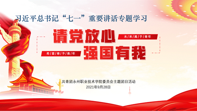 深入学习贯彻习近平总书记“七一”重要讲话精神,是当前和今后一个时期共青团的首要政治任务,也是共青团“学党史、强信念、跟党走”学习教育的核心内容。9月28日,校团委在全校开展了习近平总书记七一重要讲话专题学习暨“请党放心,强国有我”主题团日活动,切实加强了对广大团员青年的思想政治引领,引导团员青年永远感党恩、听党话、跟党走。