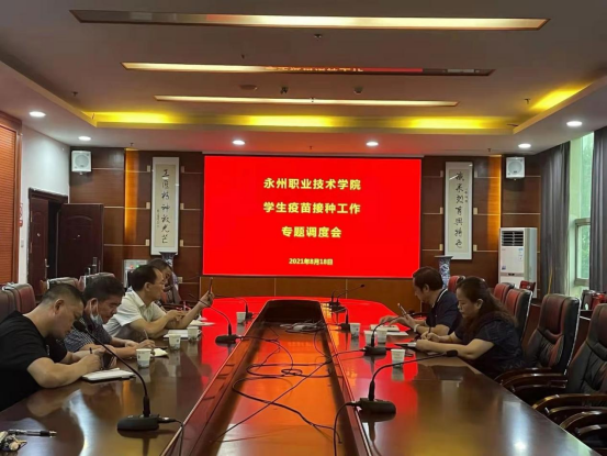 8月18日上午9:00,在校本部办公楼三楼会议室,学校党委委员、副校长杨铭主持召开了永州职院学生新冠肺炎疫苗接种专题调度视频工作会议,参会人员有原院长助理罗敏杰、各二级学院书记、学生工作部及总务处主要负责人等相关人员。