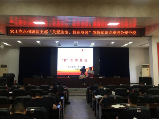 为深入推进永州市2020年入职新警们对生命安全知识教育,有效提高新入职警务人员急救知识和技术水平,5月15日上午,农工党永州职院支部副主委卢桂云同志受邀来到永州市公安干校为200名2020年入职的公安系统的新警们开展了一场以“关爱生命 救在你身边”为主题的急救知识普及讲座。