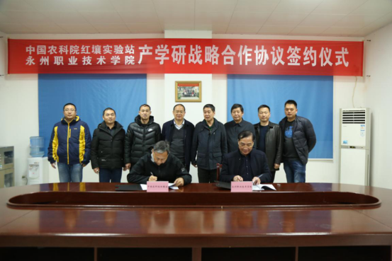 为了加快推进永州市现代农业产业发展,打造优势特色产业,提升学校科研水平,促进我校现代农业技术一流专业群建设。12月13日,学校党委委员、纪委书记蒋衡湘研究员受校长翟惠根的委托前往祁阳红壤实验站出席永州职业技术学院与祁阳红壤实验站产学研战略合作签约仪式。中国农业科学院农业资源与农业区域研究所副所长吴文斌研究员、祁阳红壤实验站站长张会民研究员、副站长文冬林研究员、副站长李冬初副研究员、祁阳红壤实验站党支部书记黄晶副研究员、农学院院长于桂阳及相关教师出席会议。