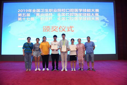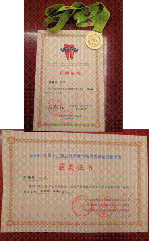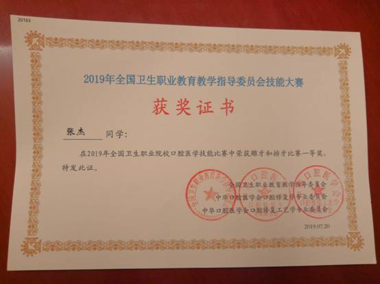 2019年全国卫生职业院校口腔医学技能大赛,第五届“黄炎培杯”全国口腔医学技能大赛,第十七届“日进杯”全国口腔医学技能大赛于7月19~21日在山东枣庄职业学院举行。我校获得两个一等奖。