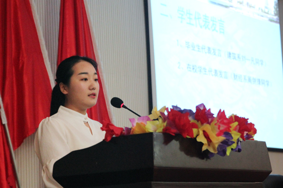 毕业典礼在激昂的国歌声中拉开帷幕。财经系学生周剑锋代表在校学生发言;建筑工程系学生刘一凡代表毕业生发言,她向为同学们付出辛勤劳动的领导和老师表达了真诚的感谢和深深的依恋,并郑重承诺在未来的工作、学习和生活中,牢记各位老师的谆谆教诲,为弘扬永职精神去谱写人生的新篇章;王淑一老师代表老师发言,她用朴实的话语、真挚的情感给同学们送上了温馨的祝愿。