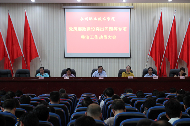 根据省委教育工委、省教育厅的统一部署,学院党委研究决定,从今年4月份到今年底,在全院范围内开展党风廉政建设突出问题专项整治工作。为使学院专项整治工作有序推进并取得实效,院党委制定下发了《永州职业技术学院党风廉政建设突出问题专项整治工作方案》(永职院党发〔2016〕14号)、《永州职业技术学院“雁过拔毛”式腐败问题专项整治工作方案》(永职院党发〔2016〕15号)和《永州职业技术学院“纠‘四风’、治陋习”专项整治工作实施方案》(永职院党发〔2016〕16号)等三个文件。党委副书记、院长翟惠根同志对三个文件进行了解读。他要求各部门、各党支部,按照院党委的安排部署,明确责任、强化措施,抓好工作落实;相关部门要搞好督促检查,确保专项整治工作取得实效。