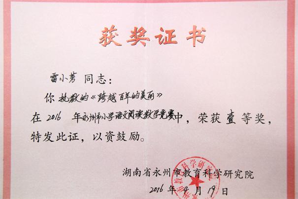 近日,永州市小学语文阅读教学竞赛教学观摩研讨课活动在冷水滩京华中学举行,来自全市11个县区共14位老师参与了赛课。附属学校雷小芳老师代表执教的《跨越百年的美丽》荣获市一等奖第一名。雷小芳老师以独具匠心的教学设计、清新诙谐的教学语言、亲切纯美的教学形象、鲜活灵动的课堂表现,让台下听课的近千名老师爆发出一阵阵掌声。