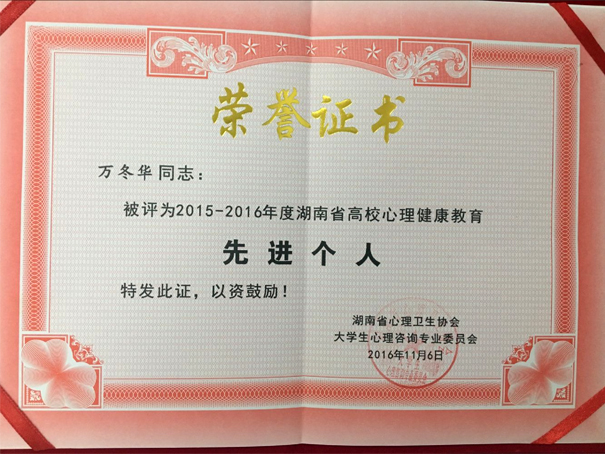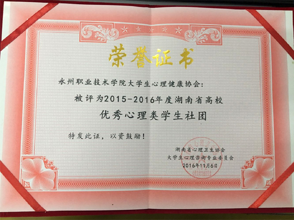 11月5日-6日,湖南省心理卫生协会大学生心理咨询专业委员会第十一届年会在湖南社会主义学院隆重召开。年会上,我院被评为“湖南省心理健康教育先进单位”; 万冬华老师被评为“湖南省高校心理健康教育工作先进个人”;学院大学生心理健康协会被评为“湖南省高校优秀心理类学生社团”。