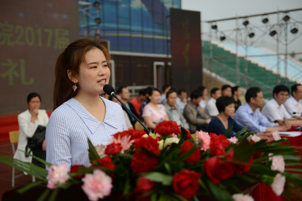 护理系王咏代表2017届毕业生回忆三年永职生活的点点滴滴,表达了对母校的感谢。财经系尚明晨同学代表在校生表达了对学长学姐们最忠心的祝愿。护理系李霞老师代表全体教师对即将离校的学子们表达了美好的祝福。