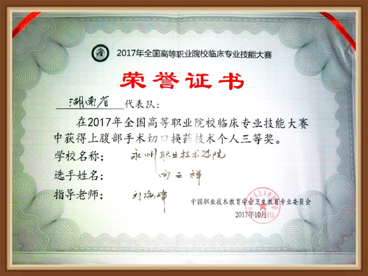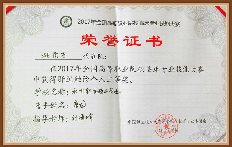 10月26日-28日,全国首届高等职业院校临床专业技能大赛在长沙卫生职业学院举行。我院临床医学系学生唐龙、向云祥代表湖南省队出赛,其中,唐龙荣获肝脏触诊技术项目二等奖,向云祥荣获上腹部切口换药技术项目三等奖。