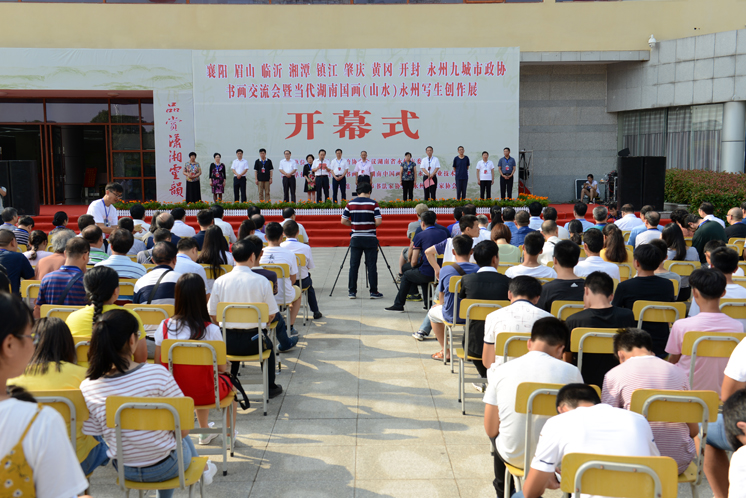 9月18日上午,襄阳、眉山、临沂、湘潭、镇江、肇庆、黄冈、开封、永州九城市政协书画交流会暨当代湖南国画(山水)永州写生展在我院图书馆隆重举行。市委副书记、市委政法委书记张严,市委常委、市委宣传部长刘尤碧,市政协主席蒋善生,学院党委书记黄小明,党委副书记、院长翟惠根出席开幕仪式。