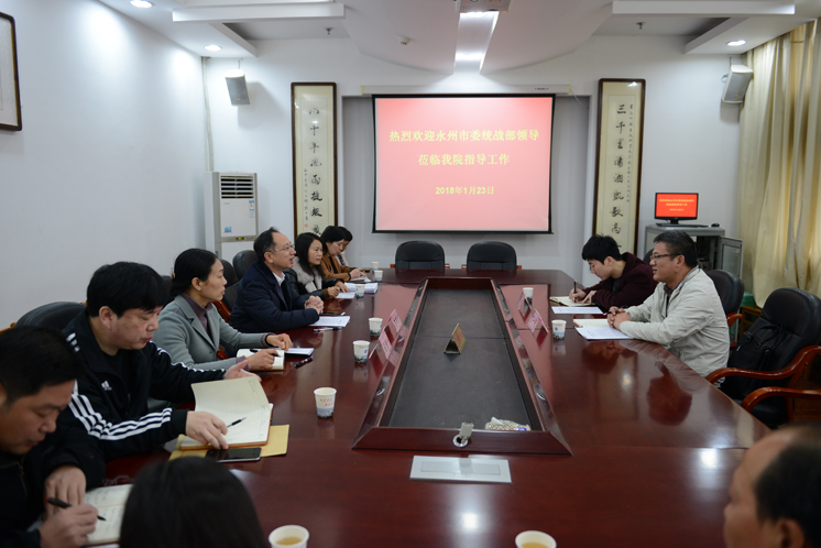 1月23日,永州市委统战部副部长、市工商联党组书记贺一夫率队来院调研高校统战工作。学院党委副书记李国春出席调研座谈会并作专题汇报,党委委员、宣传统战部部长裴有为主持调研座谈会。调研座谈会在院本部四楼会议室举行。学院各民主党派基层组织、无党派知识分子联谊会负责人和宣传统战部工作人员参加座谈。