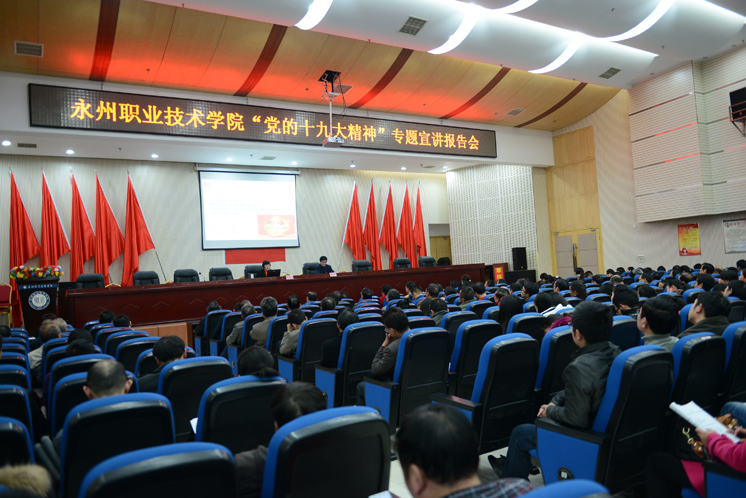 11月24日下午,永州市委宣讲团到我院宣讲党的十九大精神。永州市委宣讲团成员、市直属机关工委书记郑文飞向学院党员干部及师生300多人作了宣讲报告。