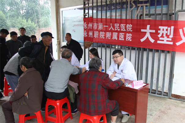 义诊现场,来自我院附属医院(永州市第一人民医院)和永州市中心医院泌尿科、骨科、心血管内科、耳鼻喉科、神经内科、超声科组成的医疗护理专家团队,义务为敬老院的老人们和周围群众进行B超检查、听诊、查体、测血压、测血糖及健康咨询,并免费提供药品和治疗方案,受到当地老百姓的热烈欢迎,取得了良好的社会效应。