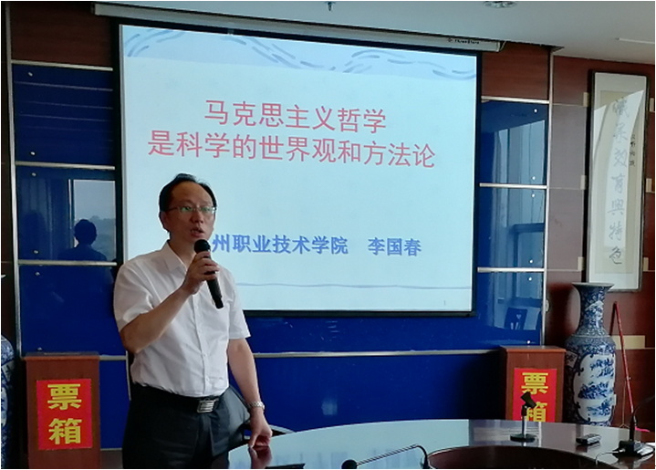 李国春以“马克思主义哲学是科学的世界观和方法论”为主题,通过回顾鸦片战争、洋务运动、苏联解体等失败案例的惨痛教训来引入党课,重点阐述了新时期党员干部学习马克思主义哲学的重要性和紧迫性,马克思主义哲学的实质、科学体系及其评价、转化的途径和学习的方法。论证了没有马克思主义,就没有社会主义,就没有中国共产党,更没有新中国;马克思主义哲学不仅没有过时,更不能丢!