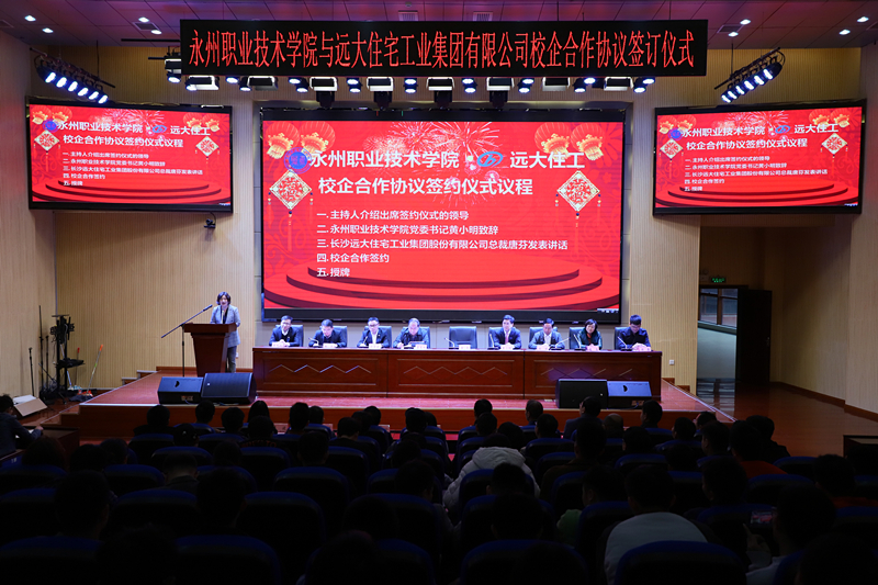 11月20日下午,永州职业技术学院与远大住宅工业集团有限公司校企合作协议签约仪式在我院图书馆三楼多媒体报告厅隆重举行,学院党委书记黄小明、长沙远大住宅工业集团股份有限公司总裁唐芬出席仪式并讲话,学院党委副书记、院长翟惠根主持签约仪式。