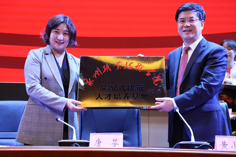 签约仪式上学院党委书记黄小明向长沙远大住宅工业集团股份有限公司总裁唐芬授予“永州职业技术学院装配式建筑人才培养基地”牌匾;唐芬代表公司向我院杨铭副院长授予“永州职业技术学院•远大住宅工业集团股份有限公司装配式建筑专业共建基地”牌匾。