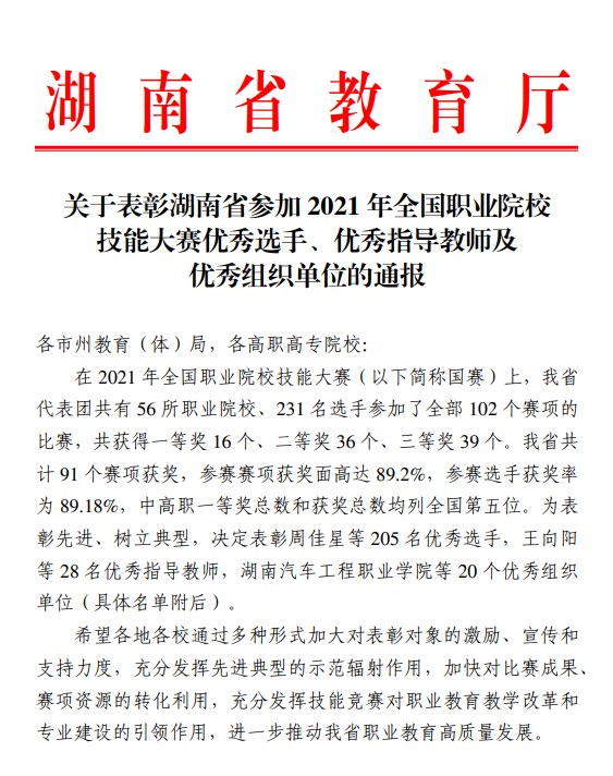 《通报》指出在2021年全国职业院校技能大赛中,我省代表团竞赛成绩斐然,共参加了全部102个赛项的比赛,获奖总数91项,其中一等奖16项,两项指标均排全国第5。