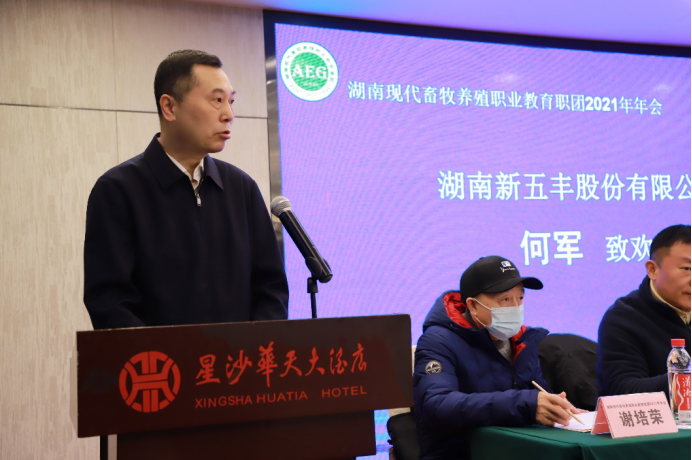 湖南新五丰股份有限公司党委书记、董事长何军代表年会承办单位对各级领导和集团代表表示欢迎并简要介绍了湖南新五丰股份有限公司的发展现状和与永州职业技术学院共建产业学院的情况。何军表示,公司将以新五丰现代畜牧产业学院为基础,全力打造产业学院发展新格局,奋力构建职业教育发展新高地,不断为校企合作作出新的贡献。更好的发挥院校科研实力强、学术基础牢固的优势,集中力量进行技术开发和人才培养,并形成相当数量的知识产权和人力资源优势,由企业完成知识产权和人才资源的市场过程。通过这种深入合作,使院校的研发和人才培养更务实,更接近市场,真正做到“论文写在猪场上,研究做在工程中,成果转化在企业里”,进一步增强职业教育适应性,大力推动湖南畜牧养殖产业的健康可持续发展。