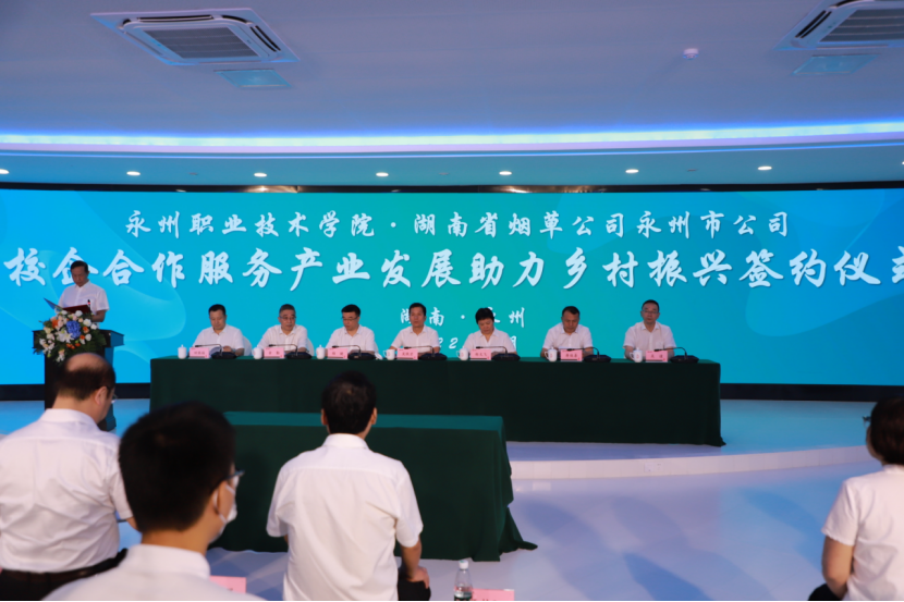 为适应现代农业产业发展新趋势,助力乡村振兴,推动县域经济发展,培育高素质新型烟叶种植、管理和服务主体,服务产业发展助力乡村振兴。9月23日上午,永州职业技术学院与湖南省烟草公司永州市公司举行“校企合作服务产业发展助力乡村振兴”签约仪式。永州市人民政府副市长吴恢才,中共永州市委组织部副部长杨健,永州职业技术学院党委副书记、校长郑文飞,永州市乡村振兴局党组书记、局长蒋俊善,永州市农业农村局党组副书记、副局长田焕福,永州市烤烟办主任吴谨,永州市烟草专卖局(公司)党组书记、局长、经理幸勤,永州职业技术学院党委委员、副校长陈强出席仪式。永州市烟草专卖局(公司)党组成员、副经理许清孝主持签约仪式。