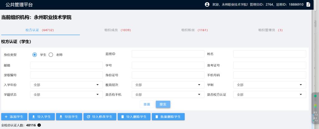 图:永职易班后台认证总人数(共48116)