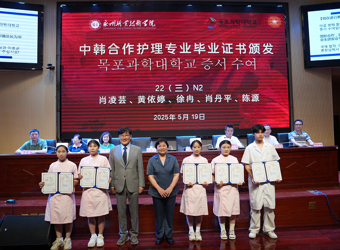 5月19日下午,我校2025届中韩合作办学护理专业毕业典礼在图书馆三楼报告厅隆重举行。校党委副书记、校长郑文飞,党委委员、宣传统战部部长黄义君,国际交流学院和护理学院相关负责人、专业骨干老师和项目全体毕业生齐聚一堂,共同见证首届毕业生的精彩荣耀。韩国木浦科学大学李镐均总长、国际交流院尹升盱、专业教授朴忠善和姜良勋参加了典礼。毕业典礼由黄义君主持。