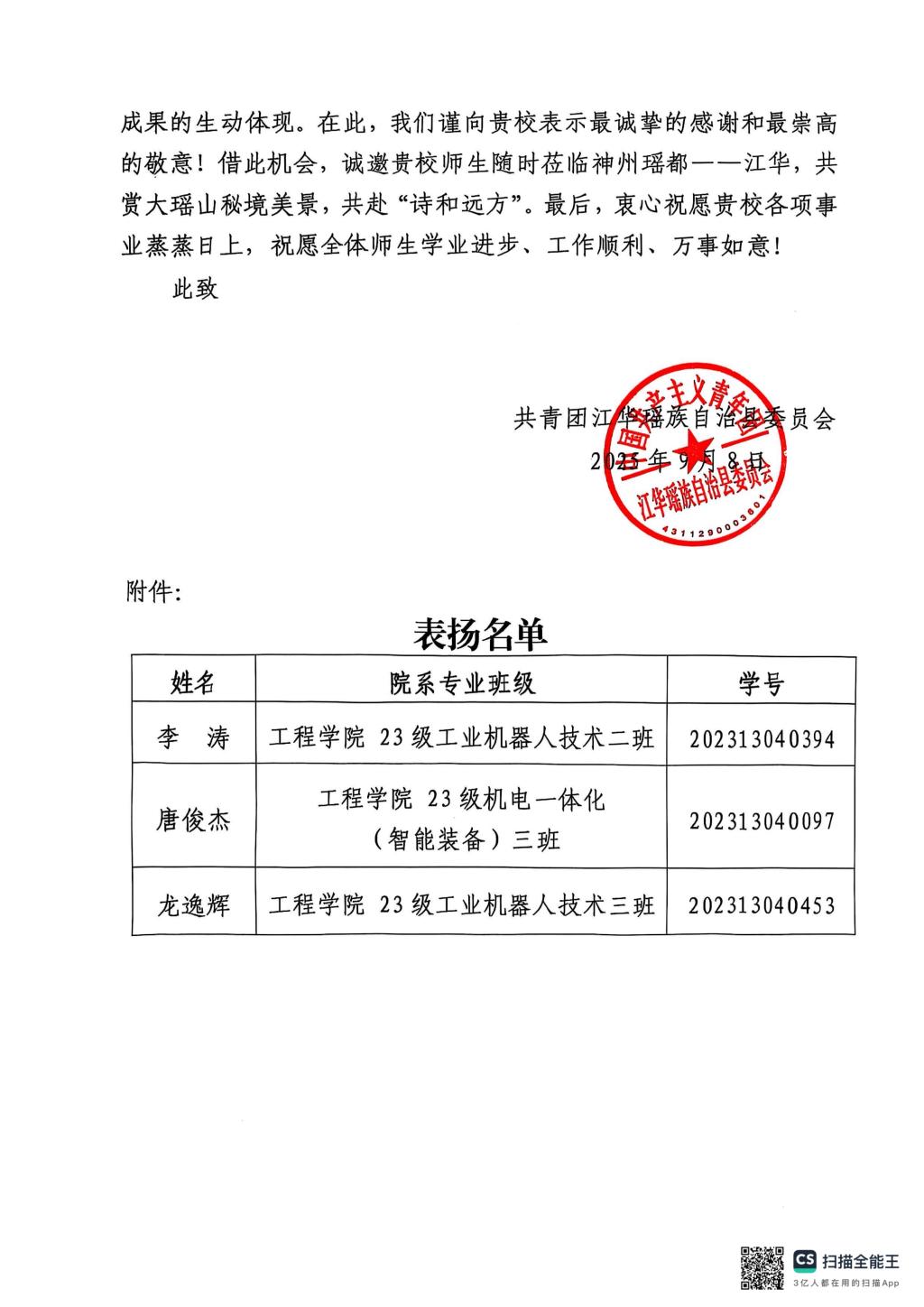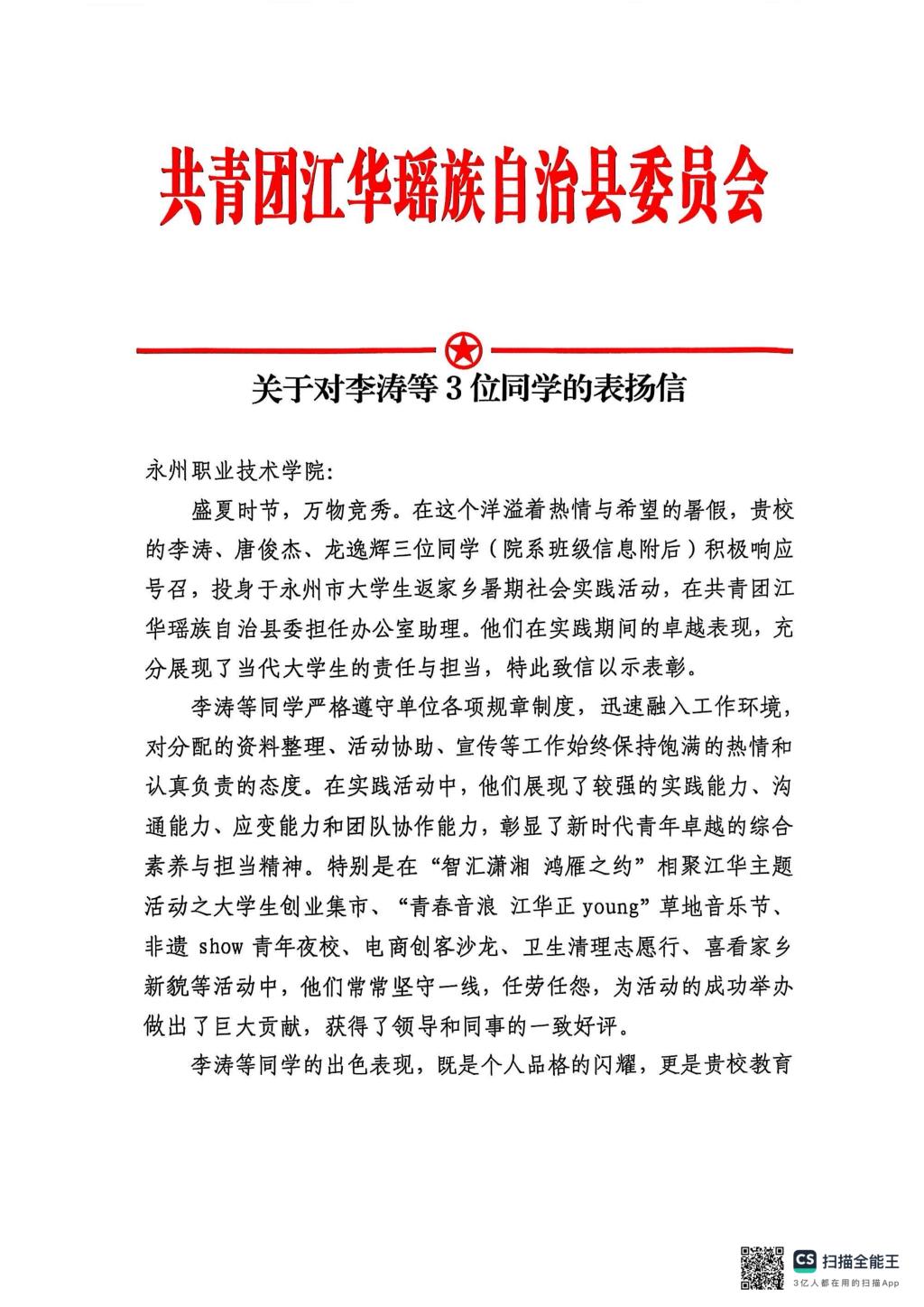 近日,共青团江华瑶族自治县委员会向我校发来表扬信,对工程学院李涛、唐俊杰、龙逸辉三位同学在2025年暑期“返家乡”社会实践活动中的优异表现予以高度肯定和通报表扬。他们在江华县团委办公室助理岗位上恪尽职守、勇于担当,积极参与多项县级重点活动,展现出卓越的专业素养、实践能力和奉献精神,为学校赢得了声誉。