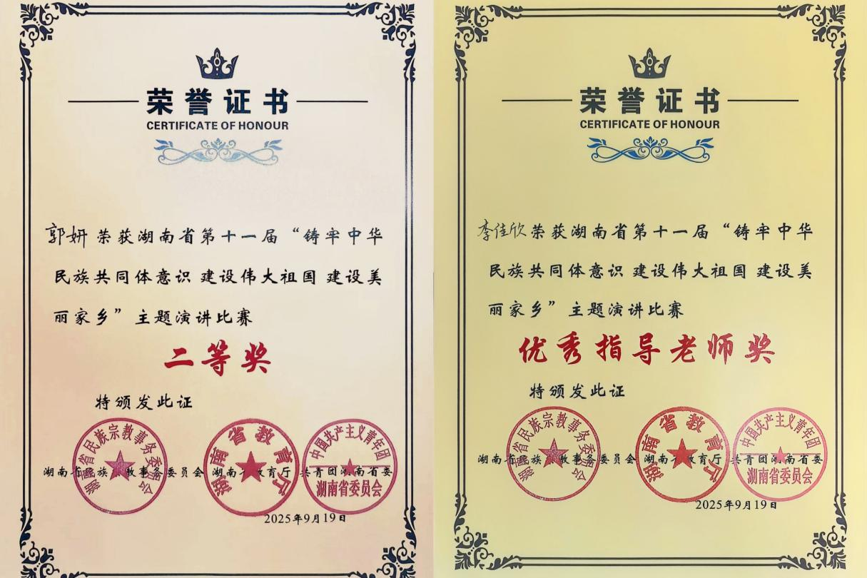 近日,湖南省第十一届“铸牢中华民族共同体意识 建设伟大祖国建设美丽家乡”主题演讲比赛决赛落幕。我校2024级中医学专业学生郭妍以《指尖上的千年青韵,层层晕染的民族共荣期望》为题,荣获高校组二等奖;指导教师李佳欣获评“优秀指导老师”。这一成绩,既充分展现了我校学子的青春风采,也标志着学校铸牢中华民族共同体意识教育工作再上新台阶。