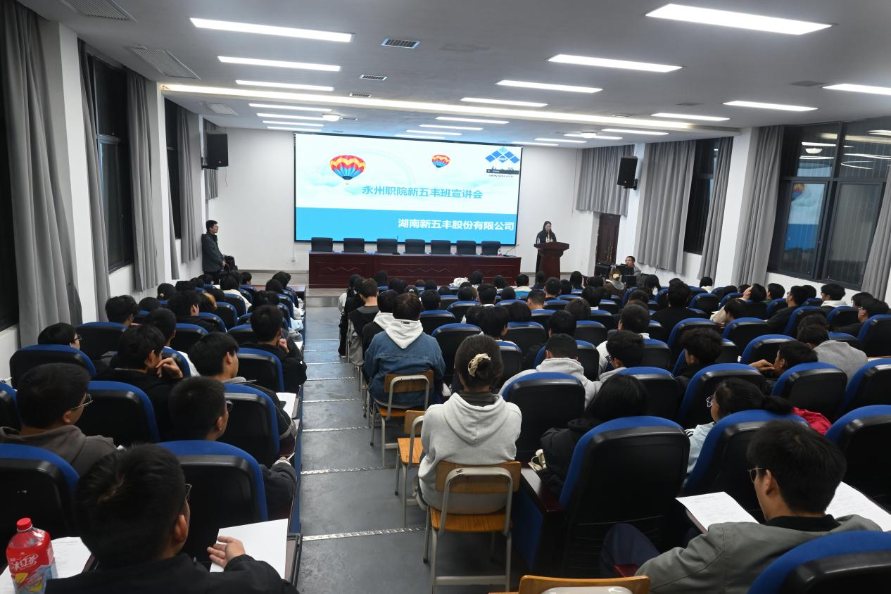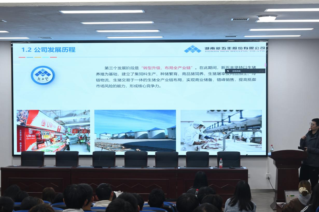 开班仪式上,葛真武从企业根基、文化内核到发展蓝图展开详细讲解。他介绍,新五丰作为中国首家生猪养殖国有上市公司,已构建起以生猪养殖为核心,涵盖饲料生产、屠宰加工、鲜肉销售的完整产业链,五十余家规模化养殖基地星罗棋布,既坐稳湖南生猪养殖龙头地位,更跻身农业产业化国家重点龙头企业行列。“为人类健康生活多做实事”的使命掷地有声,“湖南第一,国内领先”的愿景催人奋进,伴随着资质荣誉与战略规划的展示,学子们对企业实力与行业前景的认知愈发清晰。