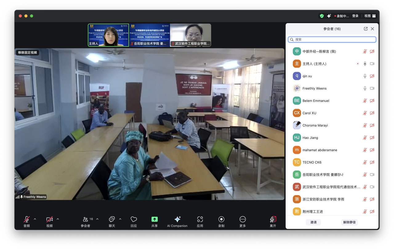 2025年10月30日北京时间16点,乍得时间9点“乍得国家职业标准共建互认项目”职业标准、专业教学标准应用推广会议首日顺利召开。本次推广会由中部外经集团承办,乍得教育主管部门领导、乍得高等教育、科研及职业培训部副部长姆拜罗·托格纳耶·拉玛吉女士、专家及教师代表联合中国多所职业院校共同参与,旨在推动中乍共建标准在乍得职业院校的落地应用。
