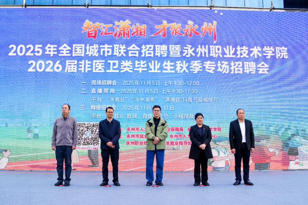 11月5日上午,由永州职业技术学院和永州市人力资源与社会保障局共同举办的永州市2025年大中城市联合招聘暨永州职业技术学院2026届非医卫类毕业生专场招聘会在永州职业技术学院图书馆广场举行。