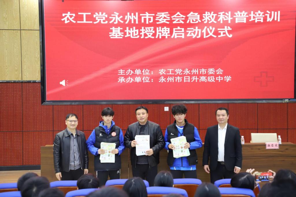 在与会嘉宾和现场群众的热烈掌声中,农工党市委会领导将“农工党永州市委会急救科普培训基地”牌匾授予永州日升学校,并交接3000份急救知识科普宣传资料。