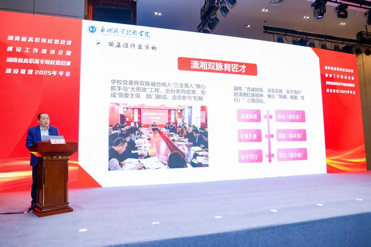 为深入学习贯彻党的二十届四中全会精神,全面提升高职院校思政课建设水平,11月13日,湖南省高职院校思政课建设工作推进会暨全省高职高专思政课建设联盟2025年年会在长沙召开,永州职业技术学院党委副书记李勇受邀参会,以“双脉铸魂育新人、职教思政显担当”为题,分享学校思政课建设的特色经验。