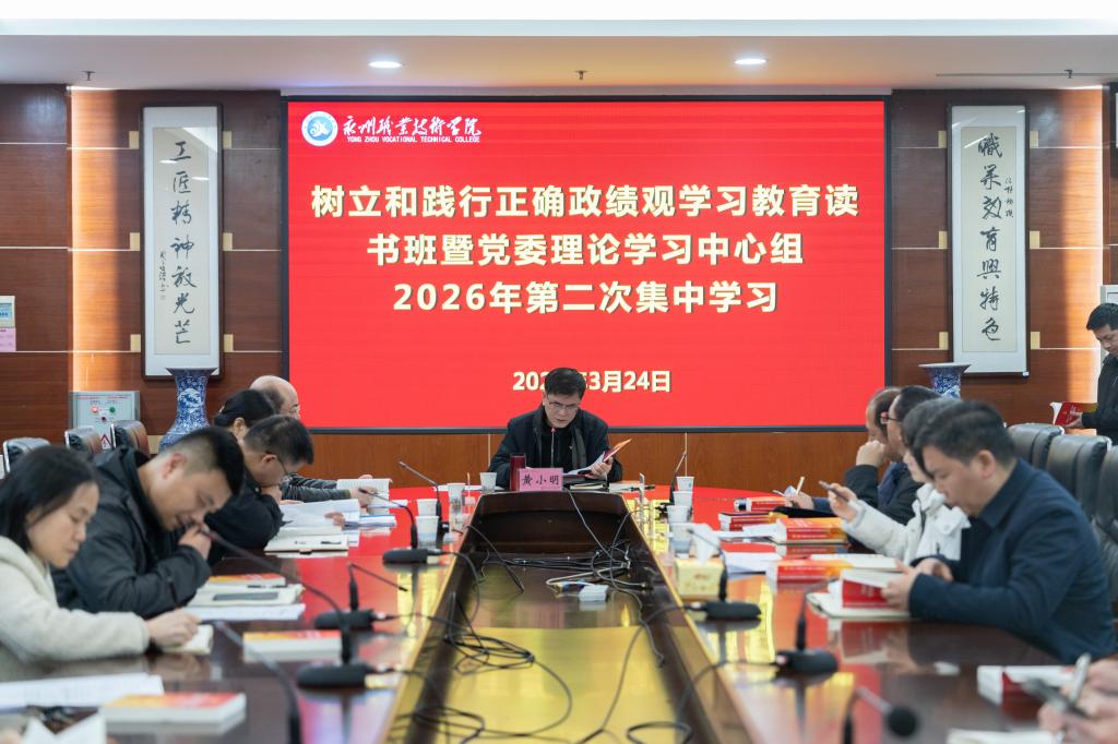 3月24日下午,永州职业技术学院在校本部二楼报告厅举行党委理论学习中心组(扩大)2026年第二次集中学习。会议由党委书记黄小明主持,在家的校领导、副科及以上干部共计150余人参加。