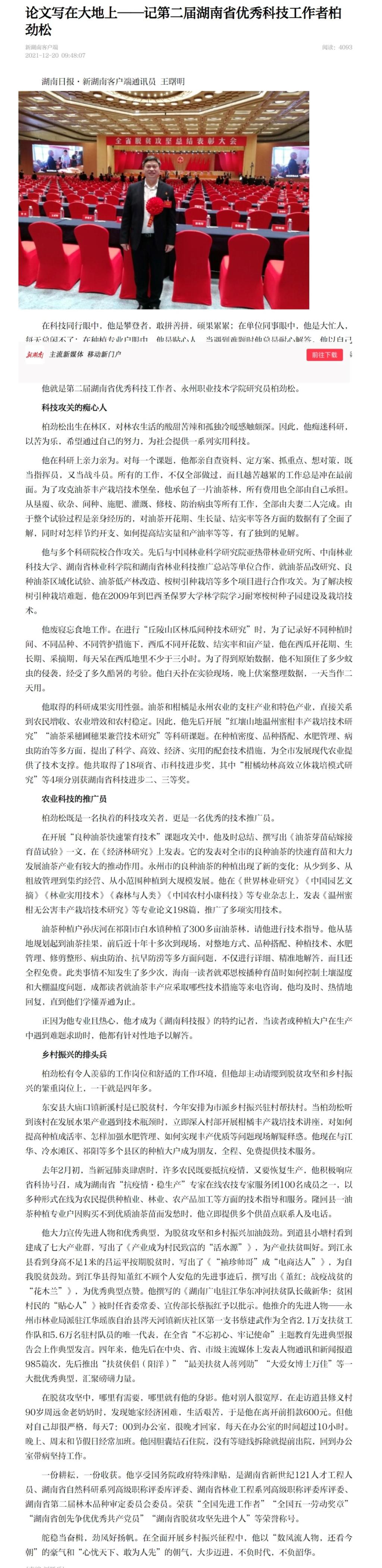 柏劲松有令人羡慕的工作岗位和舒适的工作环境,但他却主动请缨到脱贫攻坚和乡村振兴的繁重岗位上,一干就是四年多。东安县大庙口镇新溪村是已脱贫村,今年安排为市派乡村振兴驻村帮扶村。当柏劲松听到该村在发展水果产业遇到技术瓶颈时,立即深入村部开展柑橘丰产栽培技术讲座,对如何提高种植成活率、怎样加强水肥管理、如何实现丰产优质等问题现场解疑释惑。他现在与江华、冷水滩区、祁阳等多个县区的种植大户成为朋友,全程、免费提供技术服务。去年2月初,当新冠肺炎肆虐时,许多农民既要抵抗疫情,又要恢复生产,他积极响应省科协号召,成为湖南省“抗疫情·稳生产”专家在线农技专家服务团100名成员之一,以多种形式在线为农民提供种植业、林业、农产品加工等方面的技术指导和服务。隆回县一油茶种植专业户因购买不到优质油茶苗而发愁时,他立即提供多个供苗点联系人及电话。他大力宣传先进人物和优秀典型,为脱贫攻坚和乡村振兴加油鼓劲。到道县小塘村看到建成了七大产业群,写出了《产业成为村民致富的“活水源”》,为产业扶贫叫好。到江永县看到身高不足1米的吕运平按期脱贫时,写出了《“袖珍帅哥”成“电商达人”》,为自我脱贫鼓劲。到江华县得知董红不顾个人安危的先进事迹后,撰写出《董红:战疫战贫的“花木兰”》,为优秀典型点赞。他撰写的《湖南广电驻江华东冲河扶贫队长戴新华:贫困村民的“贴心人”》被时任省委常委、宣传部长蔡振红予以批示。他推介的先进人物——永州市林业局派驻江华瑶族自治县涔天河镇新庆社区第一支书蔡建武作为全省2.1万支扶贫工作队和5.6万名驻村队员的唯一代表,在全省“不忘初心、牢记使命”主题教育先进典型报告会上作典型发言。四年来,他先后在中央、省、市级主流媒体上发表人物通讯和新闻报道985篇次,先后推出“扶贫侠侣(阳洋)“最美扶贫人蒋列勋”“大爱女博士万佳”等一大批优秀典型,汇聚磅礴力量。在脱贫攻坚中,哪里有需要,哪里就有他的身影。他对别人很宽厚,在走访道县修义村90岁周远金老奶奶时,发现她家经济困难,生活艰苦,于是他在离开前捐款600元。但他对自己却很严格,每天7:00到办公室,很晚才回家,每天在办公室的时间超过10小时。晚上、周末和节假日经常加班。他因胆囊结石住院,没有等缝线拆除就提前出院,回到办公室带病坚持工作。一份耕耘,一份收获。他享受国务院政府特殊津贴,是湖南省新世纪121人才工程人员、湖南省自然科研系列高级职称评委库评委、湖南省林业工程系列高级职称评委库评委、湖南省第二届林木品种审定委员会委员。荣获“全国先进工作者”“全国五一劳动奖章”“湖南省创先争优优秀共产党员”“湖南省脱贫攻坚先进个人”等荣誉称号。舵稳当奋楫,劲风好扬帆。在全面开展乡村振兴征程中,他以“数风流人物,还看今朝”的豪气和“心忧天下、敢为人先”的朝气,大步迈进,不负时代,不负韶华。[责编:刘跃兵]