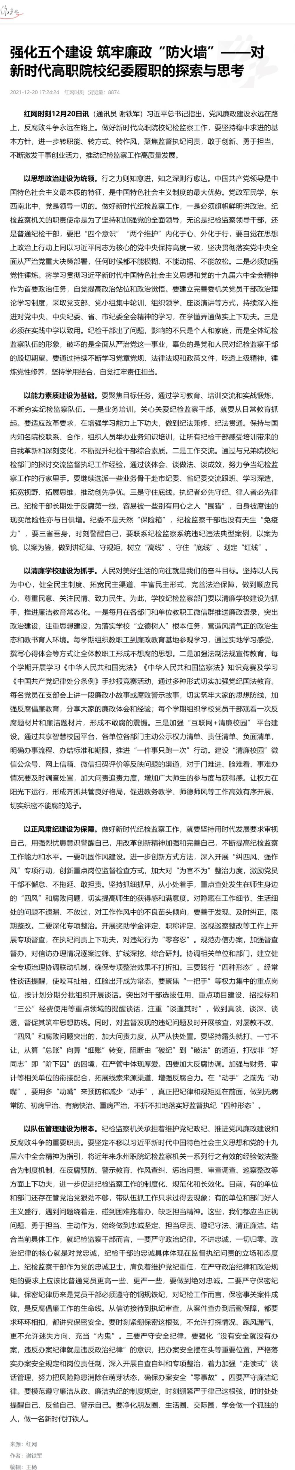 红网时刻12月20日讯(通讯员 谢铁军)习近平总书记指出,党风廉政建设永远在路上,反腐败斗争永远在路上。做好新时代高职院校纪检监察工作,要坚持稳中求进的基本方针,进一步转职能、转方式、转作风,聚焦监督执纪问责,敢于创新、勇于担当,不断激发干事创业活力,推动纪检监察工作高质量发展。