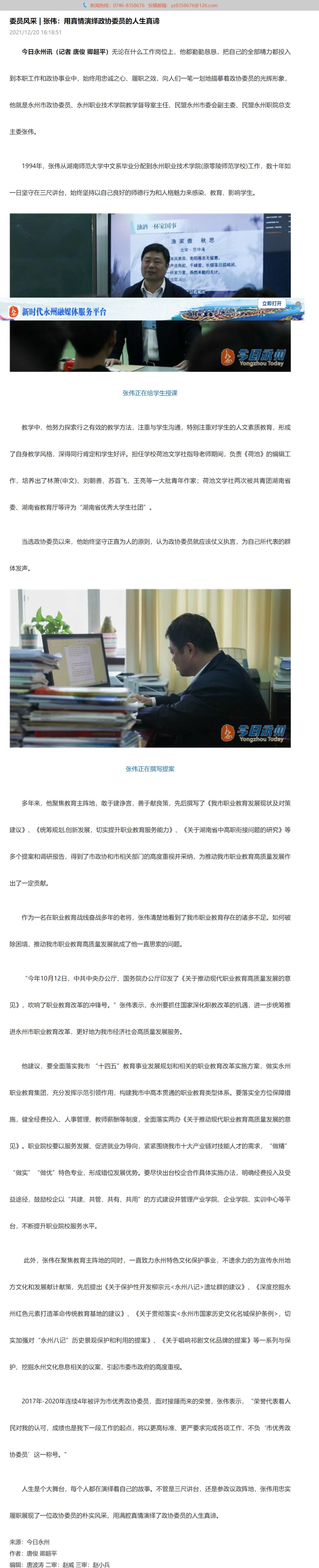 今日永州讯(记者 唐俊 卿超平)无论在什么工作岗位上,他都勤勤恳恳,把自己的全部精力都投入到本职工作和政协事业中,始终用忠诚之心、履职之效,向人们一笔一划地描摹着政协委员的光辉形象,他就是永州市政协委员、永州职业技术学院教学督导室主任、民盟永州市委会副主委、民盟永州职院总支主委张伟。