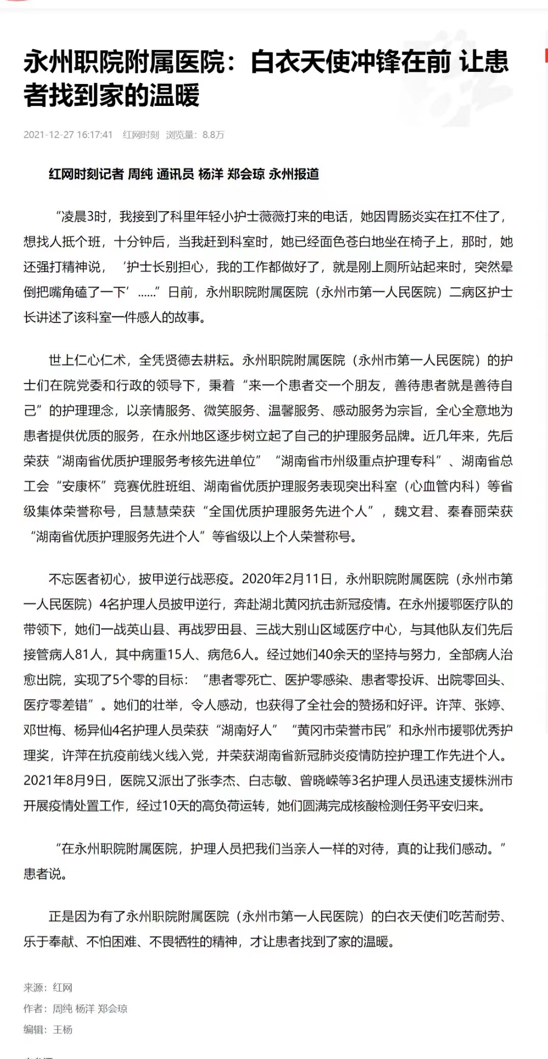 红网时刻记者 周纯 通讯员 杨洋 郑会琼 永州报道“凌晨3时,我接到了科里年轻小护士薇薇打来的电话,她因胃肠炎实在扛不住了,想找人抵个班,十分钟后,当我赶到科室时,她已经面色苍白地坐在椅子上,那时,她还强打精神说,‘护士长别担心,我的工作都做好了,就是刚上厕所站起来时,突然晕倒把嘴角磕了一下’......”日前,永州职院附属医院(永州市第一人民医院)二病区护士长讲述了该科室一件感人的故事。世上仁心仁术,全凭贤德去耕耘。永州职院附属医院(永州市第一人民医院)的护士们在院党委和行政的领导下,秉着“来一个患者交一个朋友,善待患者就是善待自己”的护理理念,以亲情服务、微笑服务、温馨服务、感动服务为宗旨,全心全意地为患者提供优质的服务,在永州地区逐步树立起了自己的护理服务品牌。近几年来,先后荣获“湖南省优质护理服务考核先进单位”“湖南省市州级重点护理专科”、湖南省总工会“安康杯”竞赛优胜班组、湖南省优质护理服务表现突出科室(心血管内科)等省级集体荣誉称号,吕慧慧荣获“全国优质护理服务先进个人”,魏文君、秦春丽荣获“湖南省优质护理服务先进个人”等省级以上个人荣誉称号。不忘医者初心,披甲逆行战恶疫。2020年2月11日,永州职院附属医院(永州市第一人民医院)4名护理人员披甲逆行,奔赴湖北黄冈抗击新冠疫情。在永州援鄂医疗队的带领下,她们一战英山县、再战罗田县、三战大别山区域医疗中心,与其他队友们先后接管病人81人,其中病重15人、病危6人。经过她们40余天的坚持与努力,全部病人治愈出院,实现了5个零的目标:“患者零死亡、医护零感染、患者零投诉、出院零回头、医疗零差错”。她们的壮举,令人感动,也获得了全社会的赞扬和好评。许萍、张婷、邓世梅、杨异仙4名护理人员荣获“湖南好人”“黄冈市荣誉市民”和永州市援鄂优秀护理奖,许萍在抗疫前线火线入党,并荣获湖南省新冠肺炎疫情防控护理工作先进个人。2021年8月9日,医院又派出了张李杰、白志敏、曾晓嵘等3名护理人员迅速支援株洲市开展疫情处置工作,经过10天的高负荷运转,她们圆满完成核酸检测任务平安归来。“在永州职院附属医院,护理人员把我们当亲人一样的对待,真的让我们感动。”患者说。正是因为有了永州职院附属医院(永州市第一人民医院)的白衣天使们吃苦耐劳、乐于奉献、不怕困难、不畏牺牲的精神,才让患者找到了家的温暖。来源:红网作者:周纯 杨洋 郑会琼编辑:王杨