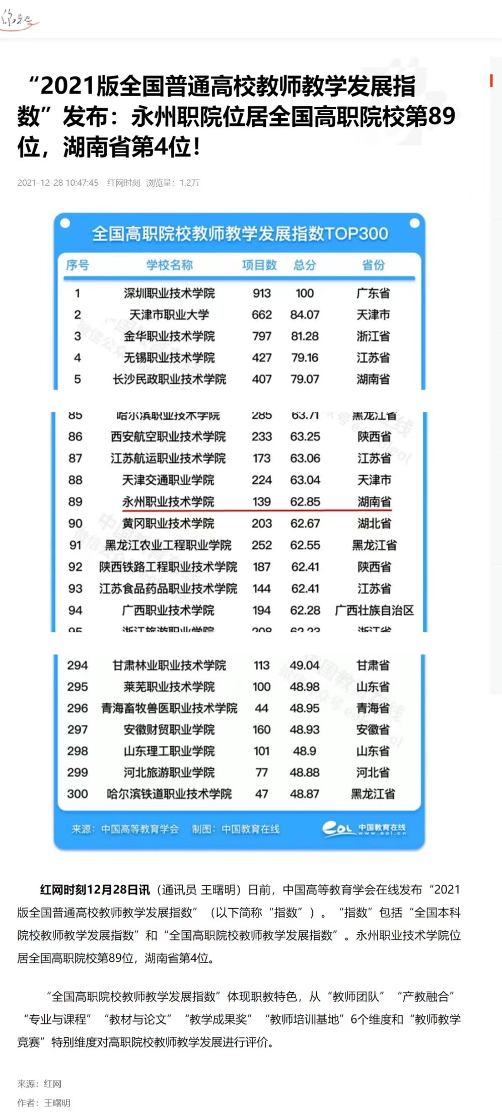 红网时刻12月28日讯(通讯员 王曙明)日前,中国高等教育学会在线发布“2021版全国普通高校教师教学发展指数”(以下简称“指数”)。“指数”包括“全国本科院校教师教学发展指数”和“全国高职院校教师教学发展指数”。永州职业技术学院位居全国高职院校第89位,湖南省第4位。“全国高职院校教师教学发展指数”体现职教特色,从“教师团队”“产教融合”“专业与课程”“教材与论文”“教学成果奖”“教师培训基地”6个维度和“教师教学竞赛”特别维度对高职院校教师教学发展进行评价。来源:红网作者:王曙明编辑:王杨