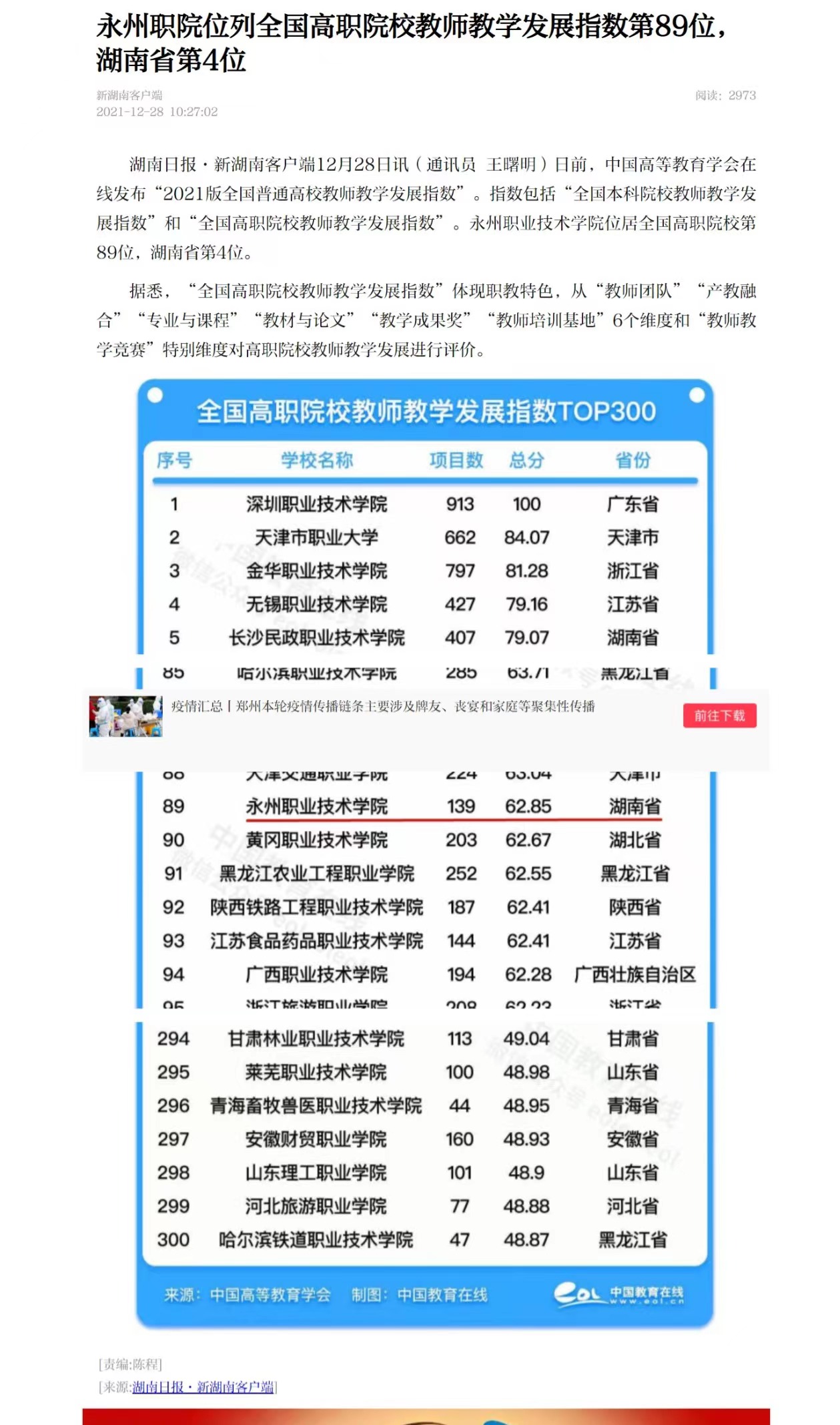 湖南日报·新湖南客户端12月28日讯(通讯员 王曙明)日前,中国高等教育学会在线发布“2021版全国普通高校教师教学发展指数”。指数包括“全国本科院校教师教学发展指数”和“全国高职院校教师教学发展指数”。永州职业技术学院位居全国高职院校第89位,湖南省第4位。据悉,“全国高职院校教师教学发展指数”体现职教特色,从“教师团队”“产教融合”“专业与课程”“教材与论文”“教学成果奖”“教师培训基地”6个维度和“教师教学竞赛”特别维度对高职院校教师教学发展进行评价。[责编:陈程][来源:湖南日报·新湖南客户端]