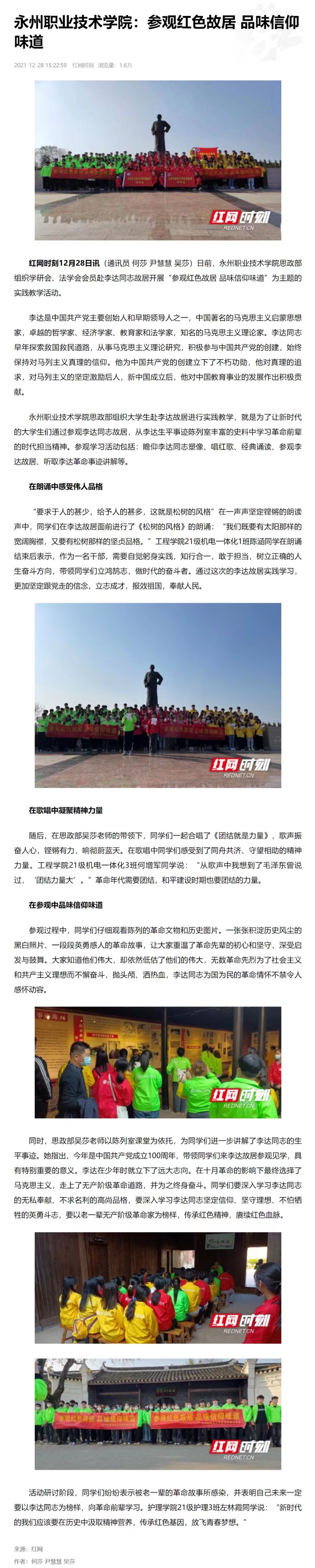 红网时刻12月28日讯(通讯员 何莎 尹慧慧 吴莎)日前,永州职业技术学院思政部组织学研会、法学会会员赴李达同志故居开展“参观红色故居 品味信仰味道”为主题的实践教学活动。李达是中国共产党主要创始人和早期领导人之一,中国著名的马克思主义启蒙思想家,卓越的哲学家、经济学家、教育家和法学家,知名的马克思主义理论家。李达同志早年探索救国救民道路,从事马克思主义理论研究,积极参与中国共产党的创建,始终保持对马列主义真理的信仰。他为中国共产党的创建立下了不朽功勋,他对真理的追求,对马列主义的坚定激励后人,新中国成立后,他对中国教育事业的发展作出积极贡献。永州职业技术学院思政部组织大学生赴李达故居进行实践教学,就是为了让新时代的大学生们通过参观李达同志故居,从李达生平事迹陈列室丰富的史料中学习革命前辈的时代担当精神。参观学习活动包括:瞻仰李达同志塑像、唱红歌、经典诵读、参观李达故居、听取李达革命事迹讲解等。在朗诵中感受伟人品格“要求于人的甚少,给予人的甚多,这就是松树的风格”在一声声坚定铿锵的朗读声中,同学们在李达故居面前进行了《松树的风格》的朗诵:“我们既要有太阳那样的宽阔胸襟,又要有松树那样的坚贞品格。”工程学院21级机电一体化1班陈涵同学在朗诵结束后表示,作为一名干部,需要自觉躬身实践,知行合一,敢于担当,树立正确的人生奋斗方向,带领同学们立鸿鹄志,做时代的奋斗者。通过这次的李达故居实践学习,更加坚定跟党走的信念,立志成才,报效祖国,奉献人民。在歌唱中凝聚精神力量随后,在思政部吴莎老师的带领下,同学们一起合唱了《团结就是力量》,歌声振奋人心,铿锵有力,响彻蔚蓝天。在歌唱中同学们感受到了同舟共济、守望相助的精神力量。工程学院21级机电一体化3班何增军同学说:“从歌声中我想到了毛泽东曾说过,‘团结力量大’。”革命年代需要团结,和平建设时期也要团结的力量。在参观中品味信仰味道参观过程中,同学们仔细观看陈列的革命文物和历史图片。一张张积淀历史风尘的黑白照片、一段段英勇感人的革命故事,让大家重温了革命先辈的初心和坚守,深受启发与鼓舞。大家知道他们伟大,却依然低估了他们的伟大,无数革命先烈为了社会主义和共产主义理想而不懈奋斗,抛头颅、洒热血,李达同志为国为民的革命情怀不禁令人感怀动容。同时,思政部吴莎老师以陈列室课堂为依托,为同学们进一步讲解了李达同志的生平事迹。她指出,今年是中国共产党成立100周年,带领同学们来李达故居参观见学,具有特别重要的意义。李达在少年时就立下了远大志向。在十月革命的影响下最终选择了马克思主义,走上了无产阶级革命道路,并为之终身奋斗。同学们要深入学习李达同志的无私奉献、不求名利的高尚品格,要深入学习李达同志坚定信仰、坚守理想、不怕牺牲的英勇斗志,要以老一辈无产阶级革命家为榜样,传承红色精神,赓续红色血脉。活动研讨阶段,同学们纷纷表示被老一辈的革命故事所感染,并表明自己未来一定要以李达同志为榜样,向革命前辈学习。护理学院21级护理3班左林霞同学说:“新时代的我们应该要在历史中汲取精神营养,传承红色基因,放飞青春梦想。”来源:红网作者:何莎 尹慧慧 吴莎编辑:王杨