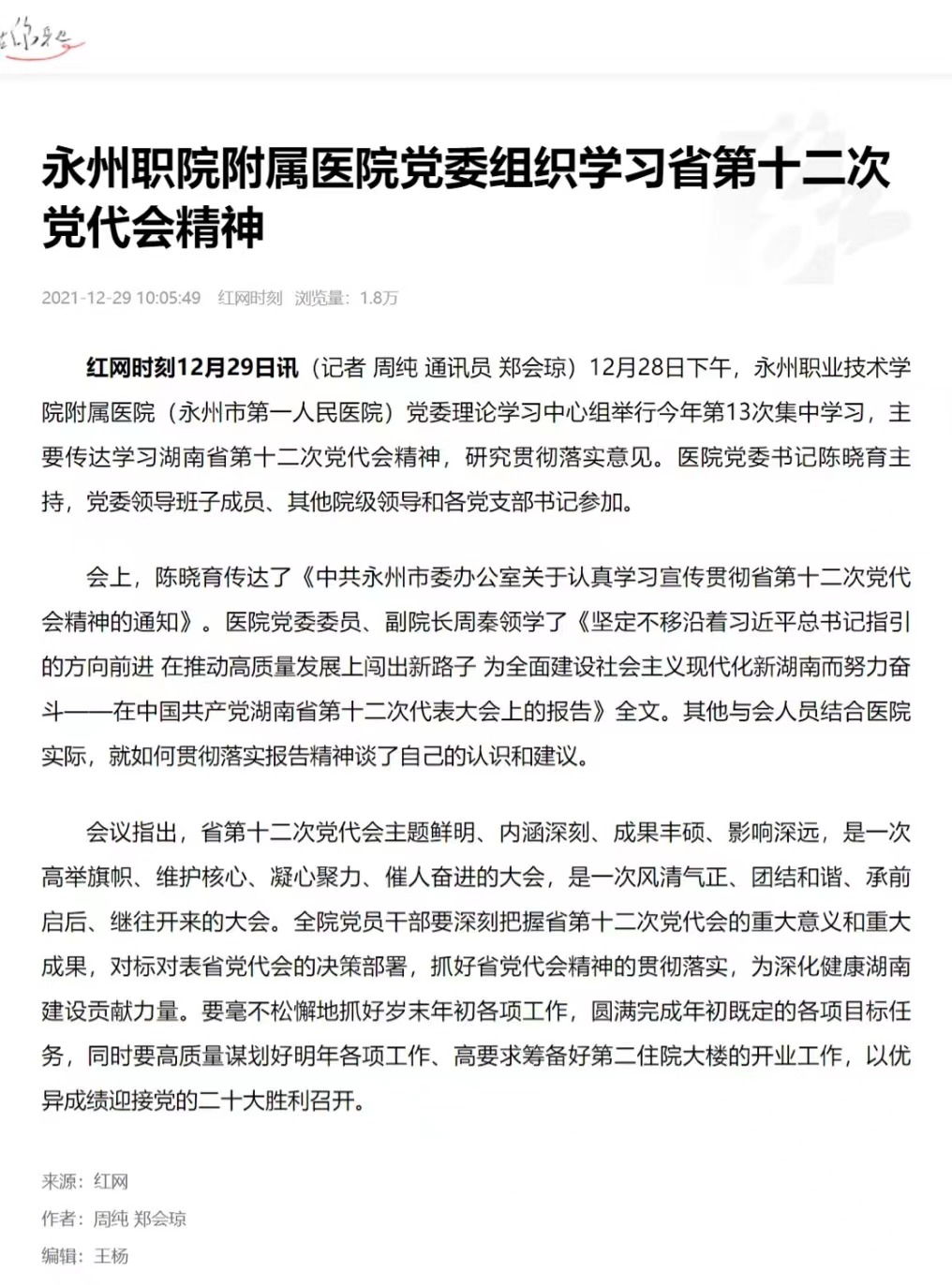 红网时刻12月29日讯(记者 周纯 通讯员 郑会琼)12月28日下午,永州职业技术学院附属医院(永州市第一人民医院)党委理论学习中心组举行今年第13次集中学习,主要传达学习湖南省第十二次党代会精神,研究贯彻落实意见。医院党委书记陈晓育主持,党委领导班子成员、其他院级领导和各党支部书记参加。会上,陈晓育传达了《中共永州市委办公室关于认真学习宣传贯彻省第十二次党代会精神的通知》。医院党委委员、副院长周秦领学了《坚定不移沿着习近平总书记指引的方向前进 在推动高质量发展上闯出新路子 为全面建设社会主义现代化新湖南而努力奋斗——在中国共产党湖南省第十二次代表大会上的报告》全文。其他与会人员结合医院实际,就如何贯彻落实报告精神谈了自己的认识和建议。会议指出,省第十二次党代会主题鲜明、内涵深刻、成果丰硕、影响深远,是一次高举旗帜、维护核心、凝心聚力、催人奋进的大会,是一次风清气正、团结和谐、承前启后、继往开来的大会。全院党员干部要深刻把握省第十二次党代会的重大意义和重大成果,对标对表省党代会的决策部署,抓好省党代会精神的贯彻落实,为深化健康湖南建设贡献力量。要毫不松懈地抓好岁末年初各项工作,圆满完成年初既定的各项目标任务,同时要高质量谋划好明年各项工作、高要求筹备好第二住院大楼的开业工作,以优异成绩迎接党的二十大胜利召开。来源:红网作者:周纯 郑会琼编辑:王杨