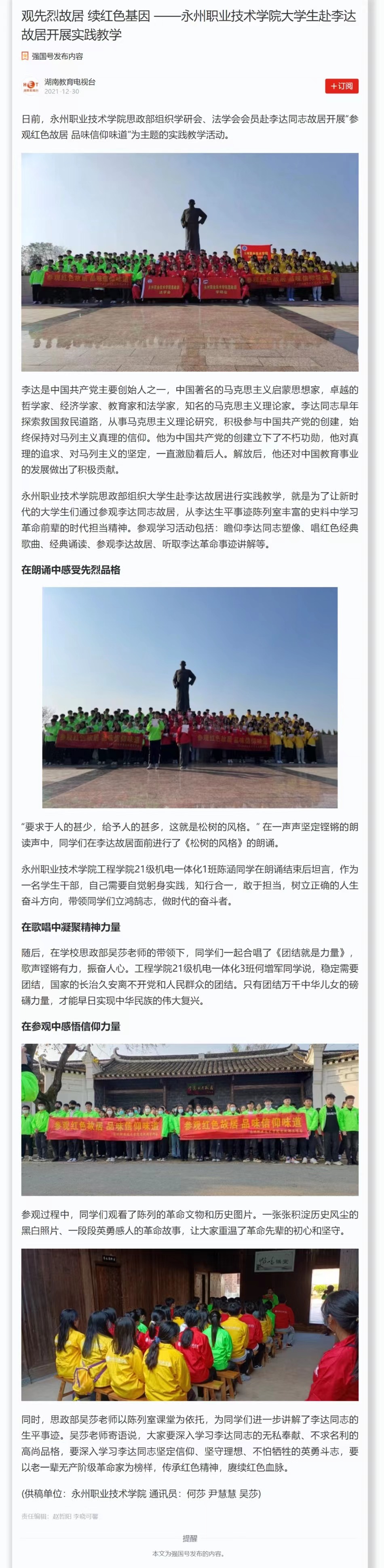 日前,永州职业技术学院思政部组织学研会、法学会会员赴李达同志故居开展“参观红色故居 品味信仰味道”为主题的实践教学活动李达是中国共产党主要创始人之一,中国著名的马克思主义启蒙思想家,卓越的哲学家、经济学家、教育家和法学家,知名的马克思主义理论家。李达同志早年探索救国救民道路,从事马克思主义理论研究,积极参与中国共产党的创建,始终保持对马列主义真理的信仰。他为中国共产党的创建立下了不朽功勋,他对真理的追求、对马列主义的坚定,一直激励着后人。解放后,他还对中国教育事业的发展做出了积极贡献。永州职业技术学院思政部组织大学生赴李达故居进行实践教学,就是为了让新时代的大学生们通过参观李达同志故居,从李达生平事迹陈列室丰富的史料中学习革命前辈的时代担当精神。参观学习活动包括:瞻仰李达同志塑像、唱红色经典歌曲、经典诵读、参观李达故居、听取李达革命事迹讲解等。在朗诵中感受先烈品格“要求于人的甚少,给予人的甚多,这就是松树的风格。” 在一声声坚定铿锵的朗读声中,同学们在李达故居面前进行了《松树的风格》的朗诵。永州职业技术学院工程学院21级机电一体化1班陈涵同学在朗诵结束后坦言,作为一名学生干部,自己需要自觉躬身实践,知行合一,敢于担当,树立正确的人生奋斗方向,带领同学们立鸿鹄志,做时代的奋斗者。在歌唱中凝聚精神力量随后,在学校思政部吴莎老师的带领下,同学们一起合唱了《团结就是力量》,歌声铿锵有力,振奋人心。工程学院21级机电一体化3班何增军同学说,稳定需要团结,国家的长治久安离不开党和人民群众的团结。只有团结万千中华儿女的磅礴力量,才能早日实现中华民族的伟大复兴。在参观中感悟信仰力量参观过程中,同学们观看了陈列的革命文物和历史图片。一张张积淀历史风尘的黑白照片、一段段英勇感人的革命故事,让大家重温了革命先辈的初心和坚守。同时,思政部吴莎老师以陈列室课堂为依托,为同学们进一步讲解了李达同志的生平事迹。吴莎老师寄语说,大家要深入学习李达同志的无私奉献、不求名利的高尚品格,要深入学习李达同志坚定信仰、坚守理想、不怕牺牲的英勇斗志,要以老一辈无产阶级革命家为榜样,传承红色精神,赓续红色血脉。(供稿单位:永州职业技术学院 通讯员:何莎 尹慧慧 吴莎)