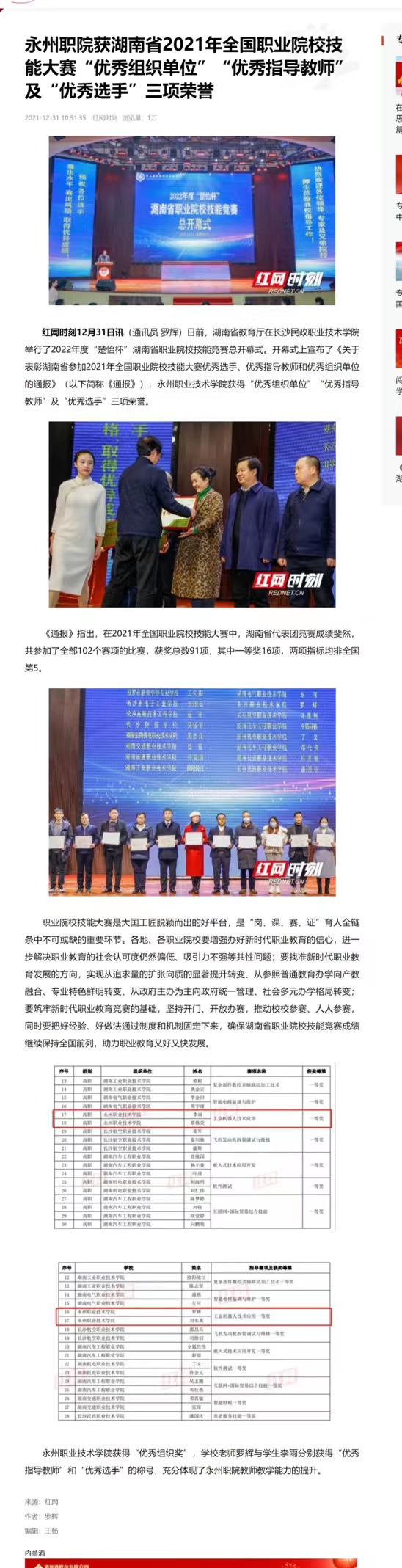 红网时刻12月31日讯(通讯员 罗辉)日前,湖南省教育厅在长沙民政职业技术学院举行了2022年度“楚怡杯”湖南省职业院校技能竞赛总开幕式。开幕式上宣布了《关于表彰湖南省参加2021年全国职业院校技能大赛优秀选手、优秀指导教师和优秀组织单位的通报》(以下简称《通报》),永州职业技术学院获得“优秀组织单位”“优秀指导教师”及“优秀选手”三项荣誉。《通报》指出,在2021年全国职业院校技能大赛中,湖南省代表团竞赛成绩斐然,共参加了全部102个赛项的比赛,获奖总数91项,其中一等奖16项,两项指标均排全国第5。职业院校技能大赛是大国工匠脱颖而出的好平台,是“岗、课、赛、证”育人全链条中不可或缺的重要环节。各地、各职业院校要增强办好新时代职业教育的信心,进一步解决职业教育的社会认可度仍然偏低、吸引力不强等共性问题;要找准新时代职业教育发展的方向,实现从追求量的扩张向质的显著提升转变、从参照普通教育办学向产教融合、专业特色鲜明转变、从政府主办为主向政府统一管理、社会多元办学格局转变;要筑牢新时代职业教育竞赛的基础,坚持开门、开放办赛,推动校校参赛、人人参赛,同时要把好经验、好做法通过制度和机制固定下来,确保湖南省职业院校技能竞赛成绩继续保持全国前列,助力职业教育又好又快发展。永州职业技术学院获得“优秀组织奖”,学校老师罗辉与学生李雨分别获得“优秀指导教师”和“优秀选手”的称号,充分体现了永州职院教师教学能力的提升。来源:红网作者:罗辉编辑:王杨