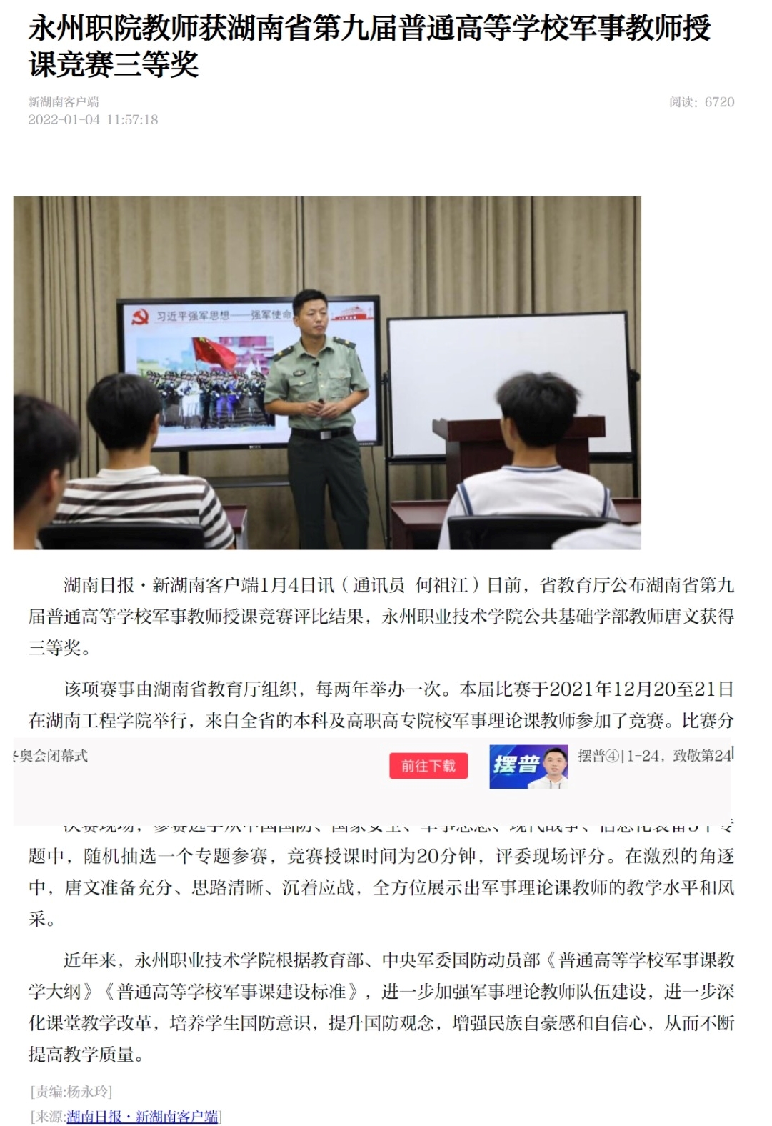 湖南日报·新湖南客户端1月4日讯(通讯员 何祖江)日前,省教育厅公布湖南省第九届普通高等学校军事教师授课竞赛评比结果,永州职业技术学院公共基础学部教师唐文获得三等奖。
