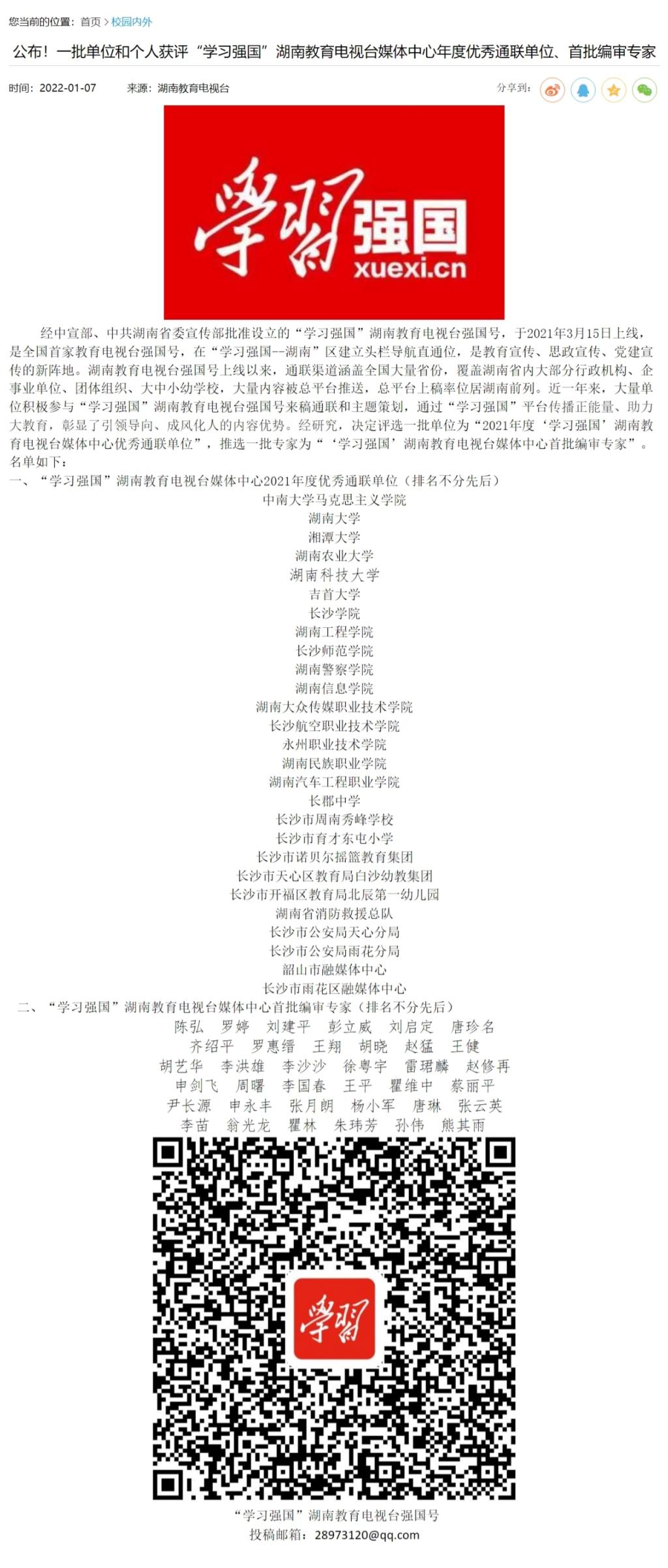 经中宣部、中共湖南省委宣传部批准设立的“学习强国”湖南教育电视台强国号,于2021年3月15日上线,是全国首家教育电视台强国号,在“学习强国--湖南”区建立头栏导航直通位,是教育宣传、思政宣传、党建宣传的新阵地。湖南教育电视台强国号上线以来,通联渠道涵盖全国大量省份,覆盖湖南省内大部分行政机构、企事业单位、团体组织、大中小幼学校,大量内容被总平台推送,总平台上稿率位居湖南前列。近一年来,大量单位积极参与“学习强国”湖南教育电视台强国号来稿通联和主题策划,通过“学习强国”平台传播正能量、助力大教育,彰显了引领导向、成风化人的内容优势。经研究,决定评选一批单位为“2021年度‘学习强国’湖南教育电视台媒体中心优秀通联单位”,推选一批专家为“‘学习强国’湖南教育电视台媒体中心首批编审专家”。名单如下:
