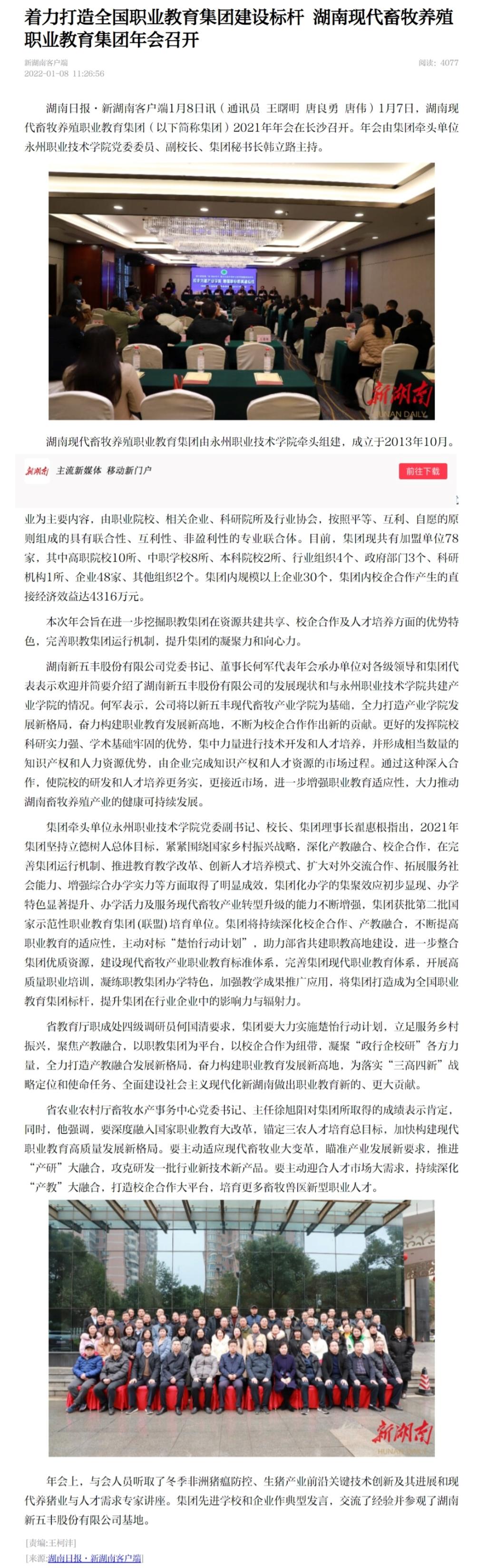 湖南日报·新湖南客户端1月8日讯(通讯员 王曙明 唐良勇 唐伟)1月7日,湖南现代畜牧养殖职业教育集团(以下简称集团)2021年年会在长沙召开。年会由集团牵头单位永州职业技术学院党委委员、副校长、集团秘书长韩立路主持。