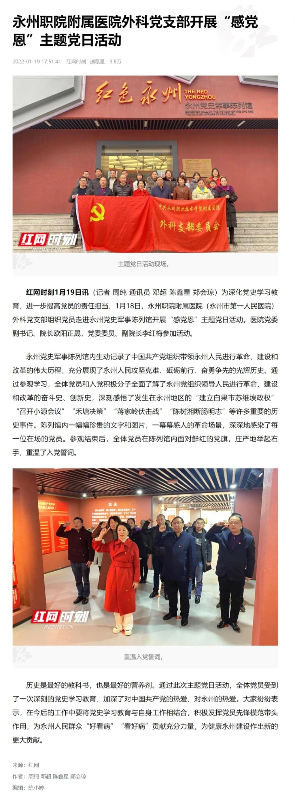 红网时刻1月19日讯(记者 周纯 通讯员 邓超 陈鑫星 郑会琼)为深化党史学习教育,进一步提高党员的责任担当,1月18日,永州职院附属医院(永州市第一人民医院)外科党支部组织党员走进永州党史军事陈列馆开展“感党恩”主题党日活动。医院党委副书记、院长欧阳正晟,党委委员、副院长李红梅参加活动。